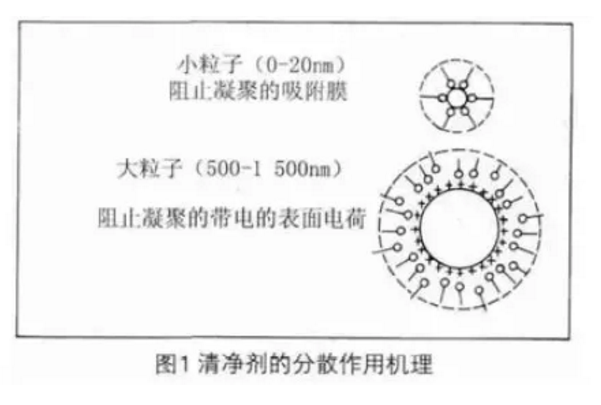 分散作用又可稱為懸浮或膠溶,即清凈劑能將已經(jīng)形成的漆膜、膠質(zhì)和積炭等固體小顆粒加以吸附,在其表面形成一層覆蓋膜而分散在油中,阻止這些非油溶性顆粒聚集成較大的顆粒沉積或黏附于氣缸上。清凈劑的分散作用機(jī)理見圖1。