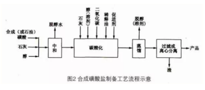 按合成途徑分,以潤滑油餾分作為原料生產(chǎn)的磺酸鹽為石油磺酸鹽;而以各種合成烷基苯為原料生產(chǎn)的磺酸鹽為合成磺酸鹽。石油磺酸鹽是以相對(duì)分子質(zhì)量為380的潤滑油餾分為原料。合成磺酸鹽的制備(以鈣鹽為例)是以生產(chǎn)12-烷基苯的副產(chǎn)物重烷基苯或烯經(jīng)與苯烷基化制得的合成烷基苯為原料,然后用發(fā)煙硫酸或So3進(jìn)行磺化,得到石油磺酸或合成磺酸;再用石灰與磺酸反應(yīng)(金屬化)生成中性磺酸鈣鹽;最后碳酸化,在醇類促進(jìn)劑存在條件下,加入石灰并通入二氧化碳,得到中堿值或高堿值磺酸鈣鹽。合成磺酸鹽的制備工藝流程見圖2。