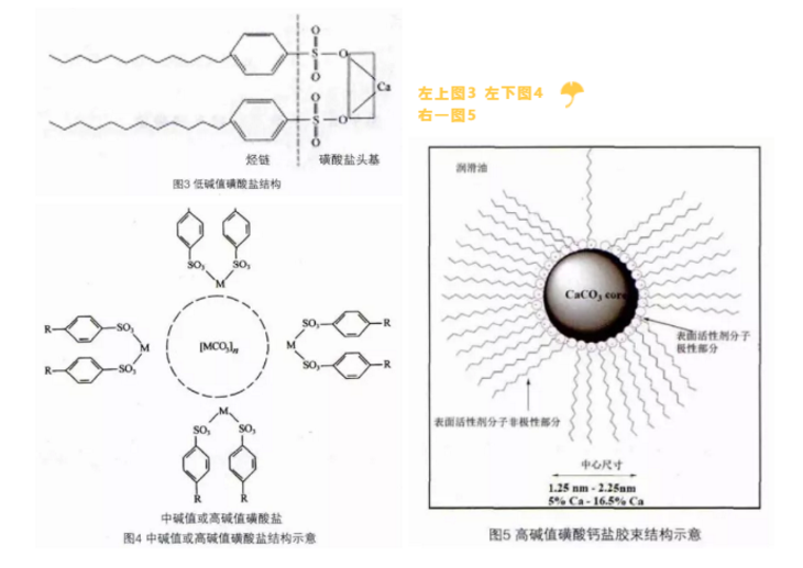 低堿值磺酸鹽中的油溶性烷基為C18~C20或以上,對(duì)油有充分溶解性的磺酸分子量在450以上。高堿值磺酸鈣鹽是通過將過剩的堿以碳酸鈣的形式分散在膠束中,形成高堿性磺酸鹽。以碳酸鈣的形式分散的鈣鹽與磺酸鹽的鈣鹽之比超過30:1。